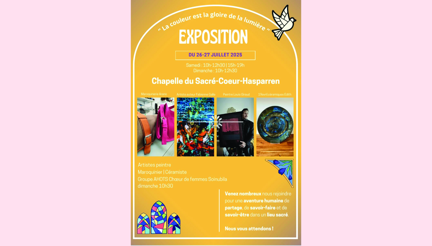 Du samedi 26 au dimanche 27 juillet, la chapelle du Sacré-Coeur à Hasparren, accueil une exposition artisanale de plusieurs créateurs ( maroquinerie, auteur, peintre, céramique ).