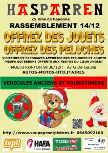 En cette période de fin d’année le club Hazpandar de véhicules anciens et historiques Soupapes et pistons organise une collecte de jouets neufs et peluches pour les familles défavorisées.