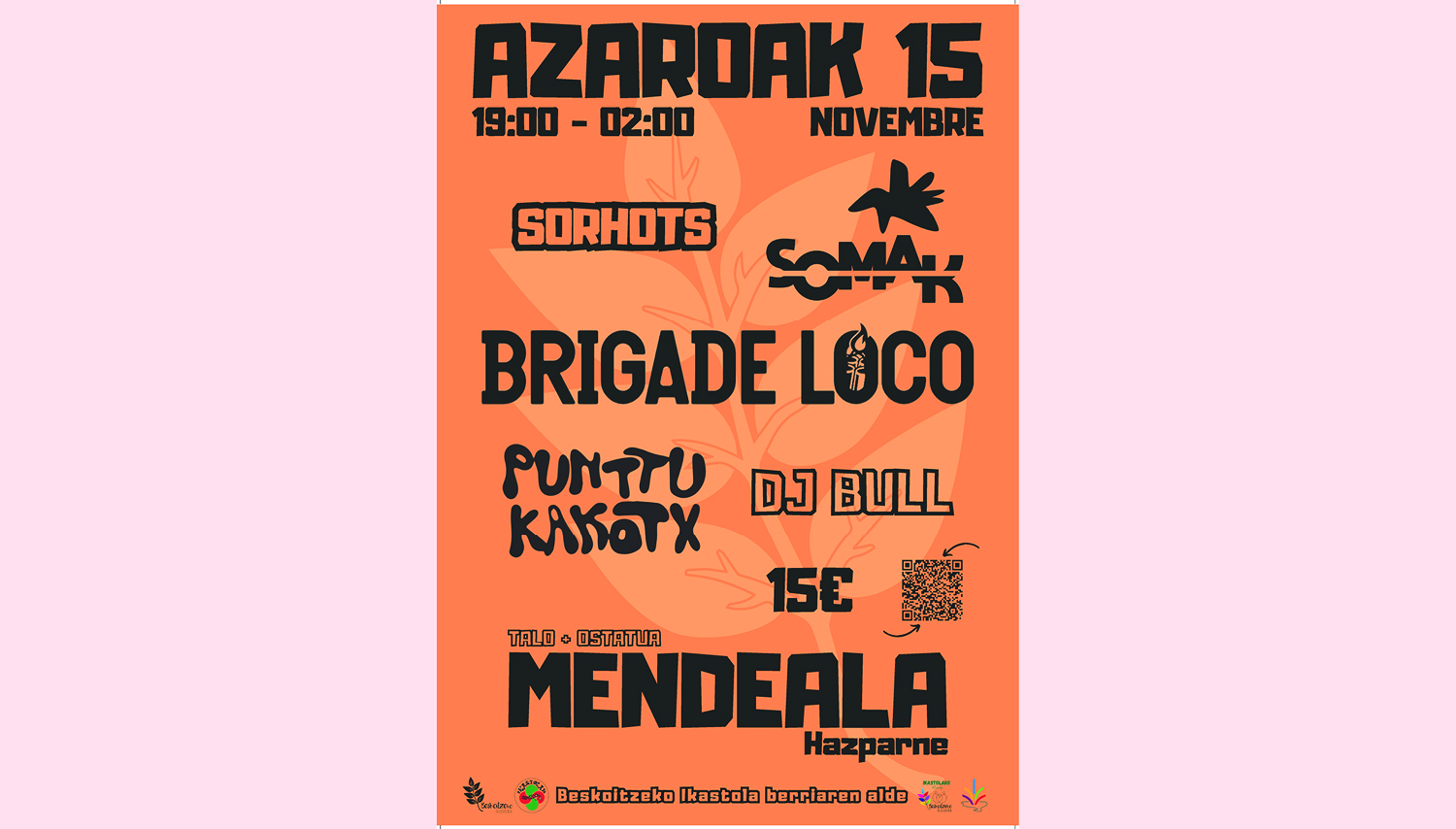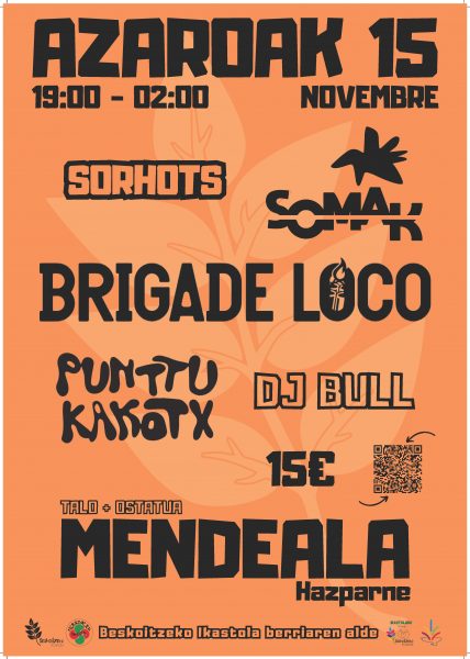 Samedi 15 novembre, à Mendeala, à partir de 19h, venez vous ambiancer avec les concert des groupes SORHOTS, SOMAK, BRIGADE LOCO, FUNKY KAKOTX et DJ BULL.