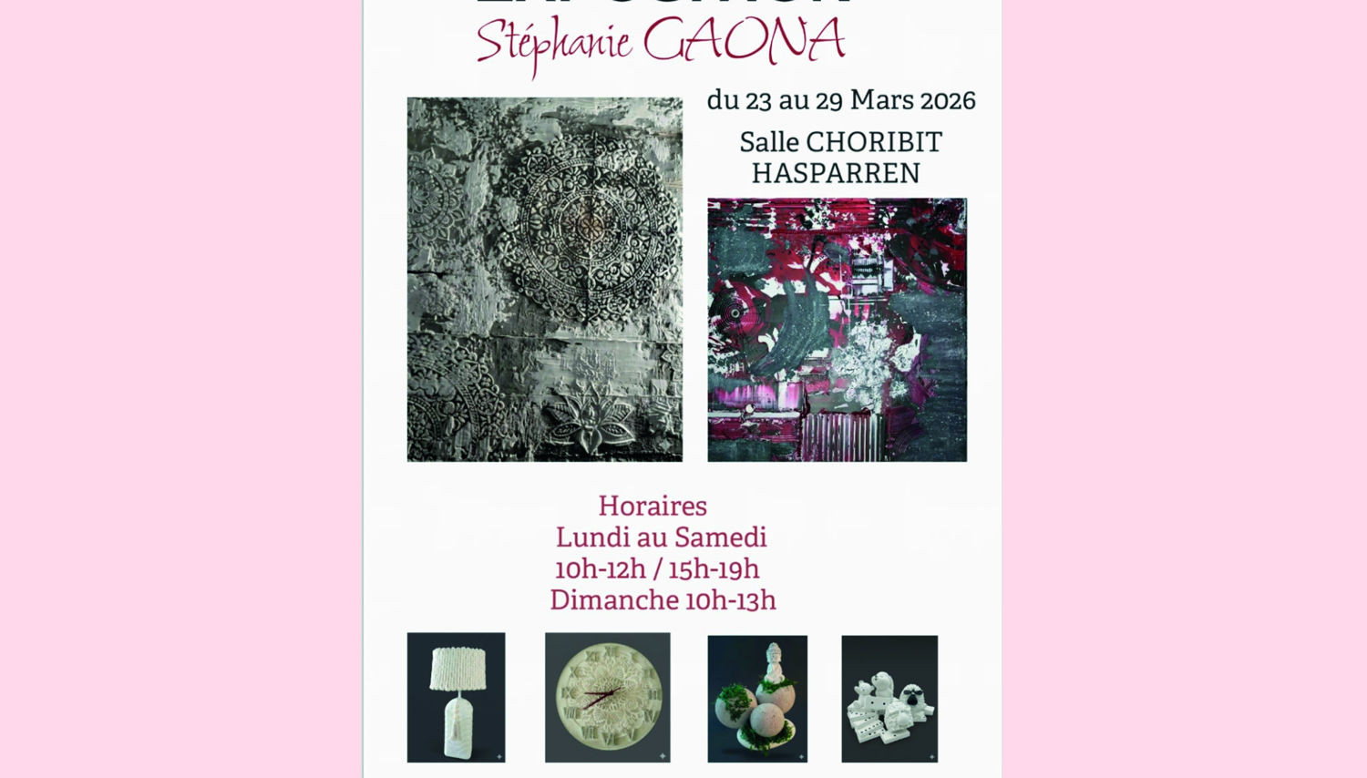 Du 23 au 29 mars, en salle Pierre Choribit, se tiendra l’exposition de l’artiste Stéphanie Gaona.