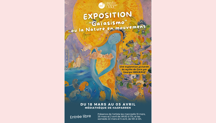 Du 18 mars au 5 avril, la médiathèque accueille l’exposition « Gaïasismo ou la Nature en mouvement » de Georgia Niekrasz, artiste indépendante. À travers ses œuvres, elle explore le lien profond entre la nature et l’humain, puisant son inspiration dans ses racines slaves et basques. Ses tableaux traduisent une vision vibrante et sensible de la Terre, à la fois force créatrice et entité vulnérable, incarnant le mythe de Gaïa, mère de toute vie.