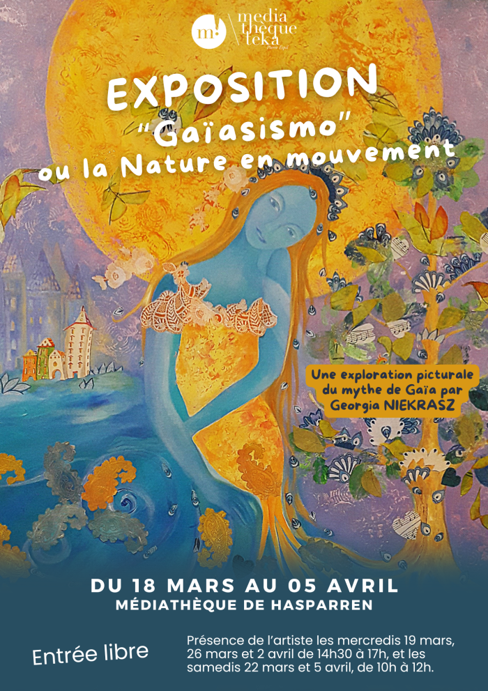 Du 18 mars au 5 avril, la médiathèque accueille l’exposition « Gaïasismo ou la Nature en mouvement » de Georgia Niekrasz, artiste indépendante. À travers ses œuvres, elle explore le lien profond entre la nature et l’humain, puisant son inspiration dans ses racines slaves et basques. Ses tableaux traduisent une vision vibrante et sensible de la Terre, à la fois force créatrice et entité vulnérable, incarnant le mythe de Gaïa, mère de toute vie.